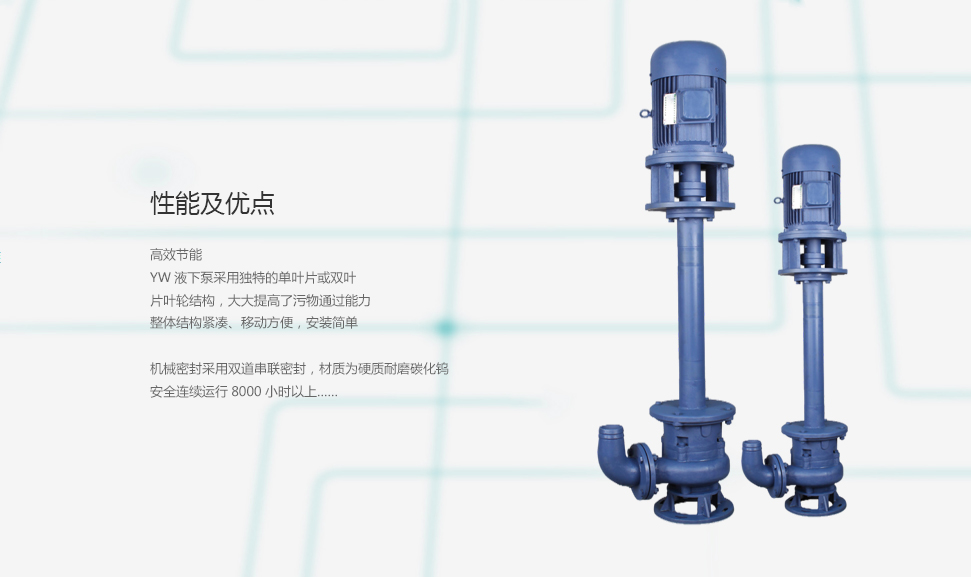 YW單管式液下排污泵是結合國內外先進技術的基礎上,液下泵的使用特點而研制成功的新一代液下排污泵產品,具有節能效果顯著、防纏繞、無堵塞等特點,在排送固體顆粒和長纖維垃圾方面具有獨特效果。