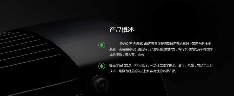 JPWQ不銹鋼攪勻式提升泵是在普通型排污泵的基礎(chǔ)上采用自動攪拌裝置,該裝置隨電機軸旋轉(zhuǎn),產(chǎn)生極強的攪拌力,將污水池內(nèi)的沉積物攪拌成懸浮物,吸入泵內(nèi)排出,提高了泵的防堵、排污能力,