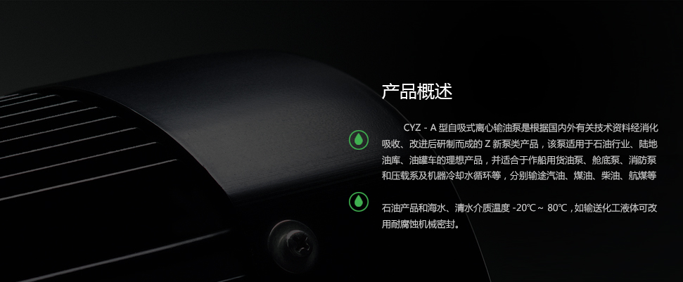 CYZ-A型自吸式離心輸油泵是根據(jù)國內(nèi)外有關(guān)技術(shù)資料經(jīng)消化、吸收、改進(jìn)后研制而成的Z新泵類產(chǎn)品,該泵適用于石油行業(yè)、陸地油庫、油罐車的理想產(chǎn)品,并適合于作船用貨油泵、艙底泵、消防泵和壓載系及機器冷卻水循環(huán)