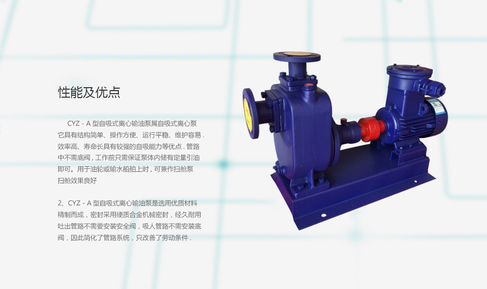 2、CYZ-A型自吸式離心輸油泵是選用優(yōu)質(zhì)材料精制而成,密封采用硬質(zhì)合金機械密封,經(jīng)久耐用,吐出管路不需要安裝安全閥,吸人管路不需安裝底閥,因此簡化了管路系統(tǒng),只改善了勞動條件.
