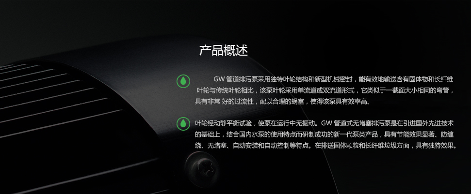 GW管道式排污泵是在引進國外先進技術(shù)的基礎(chǔ)上,結(jié)合國內(nèi)水泵的使用特點而研制成功的新一代泵類產(chǎn)品,具有節(jié)能效果顯著、防纏繞、無堵塞、自動安裝和自動控制等特點。在排送固體顆粒和長纖維垃圾方面,具有獨特效果