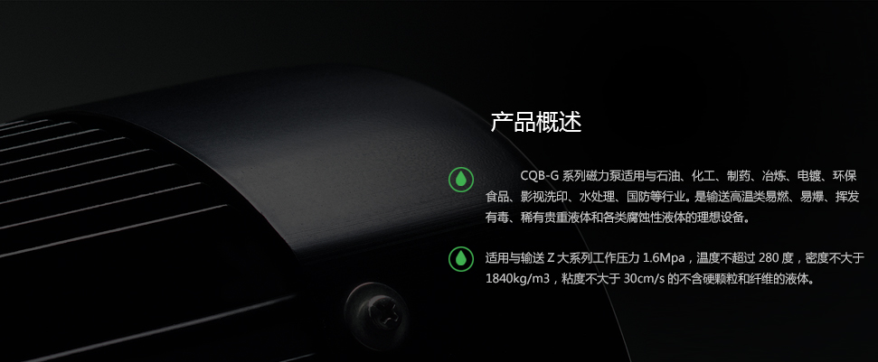 CQB-G 系列磁力泵適用與石油、化工、制藥、冶煉、電鍍、環(huán)保、食品、影視洗印、水處理、國防等行業(yè)。 是輸送高溫類易燃、易爆、揮發(fā)、有毒、稀有貴重液體和各類腐蝕性液體的理想設(shè)備。適用與輸送Z大系列工作壓力1.6Mpa,溫度不超過280度,密度不大于1840kg/m3,粘度不大于30cm/s的不含硬顆粒和纖維的液體。