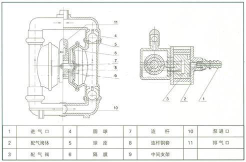 1、QBY第三代工程塑料隔膜泵的兩個對稱各種腔中,各裝有一塊有彈性的隔膜6,聯桿7將兩塊隔膜結成一體,壓縮空氣從泵的進氣接頭1進入配氣閥3后,推動兩個工作腔內的隔膜,驅使聯桿聯接的兩塊隔膜同步運動。與此同時,另一工作腔中的氣體則從其隔膜的背后排出泵外;一旦到達行程終點,配氣機構則自動地將壓縮空氣引入另一工作腔,推動隔膜朝相反方向運動,這樣就形成了兩個隔膜的同步往復運動。每個工作腔中又設置有兩個單向球閥4,隔膜的往復運動,造成工作腔內容積的改變,迫使兩個單向球閥交替地開啟和關閉,從而將液體連續地吸入和排出。